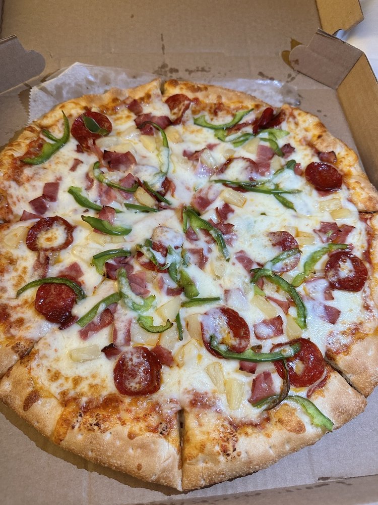 Pepperoni, sausage, ground beef, mushrooms, green peppers, onions, black olives.